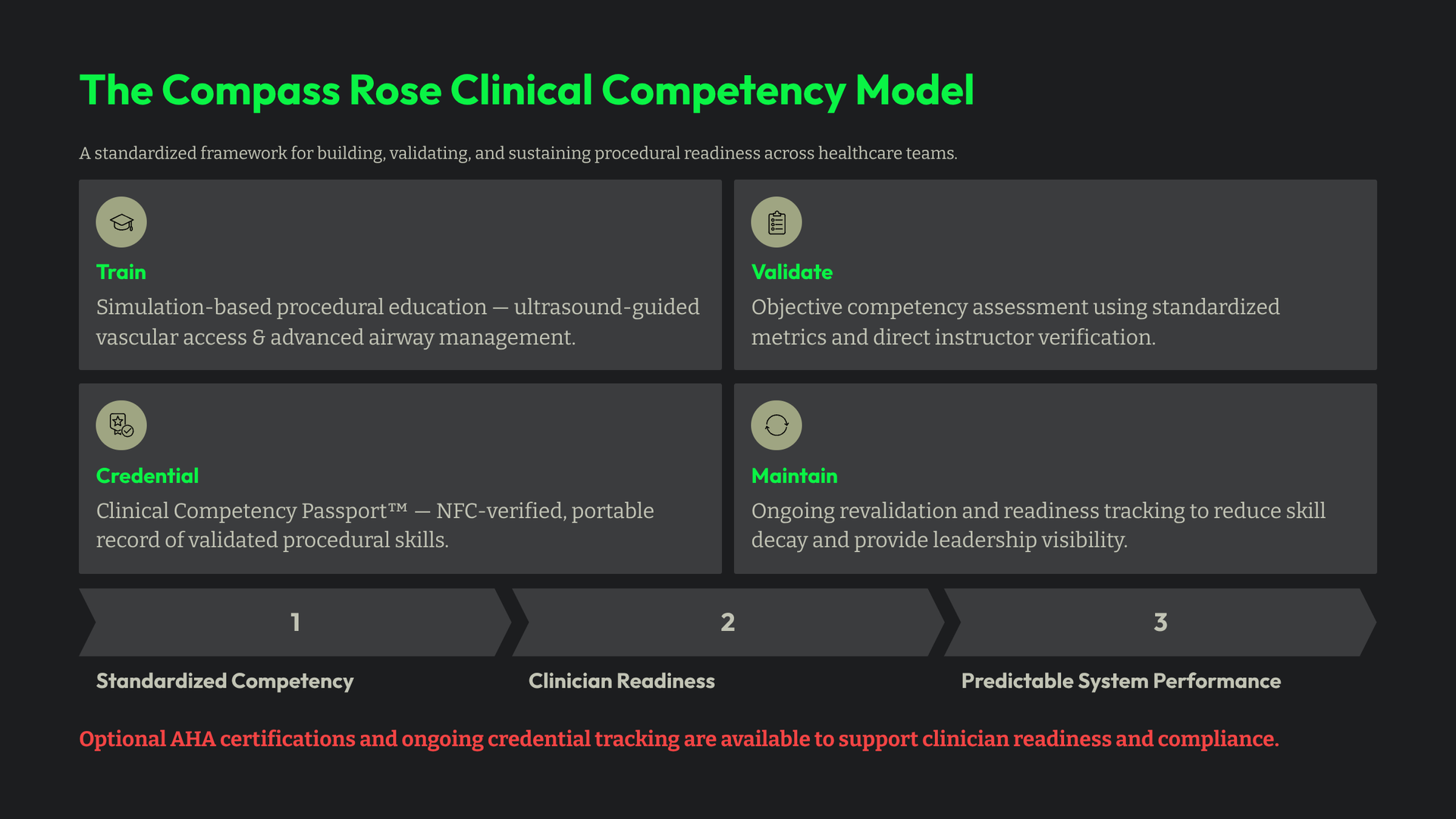 Compass Rose provides a structured training and competency validation pathway that can support healthcare organizations in maintaining high standards for clinician readiness and patient safety.